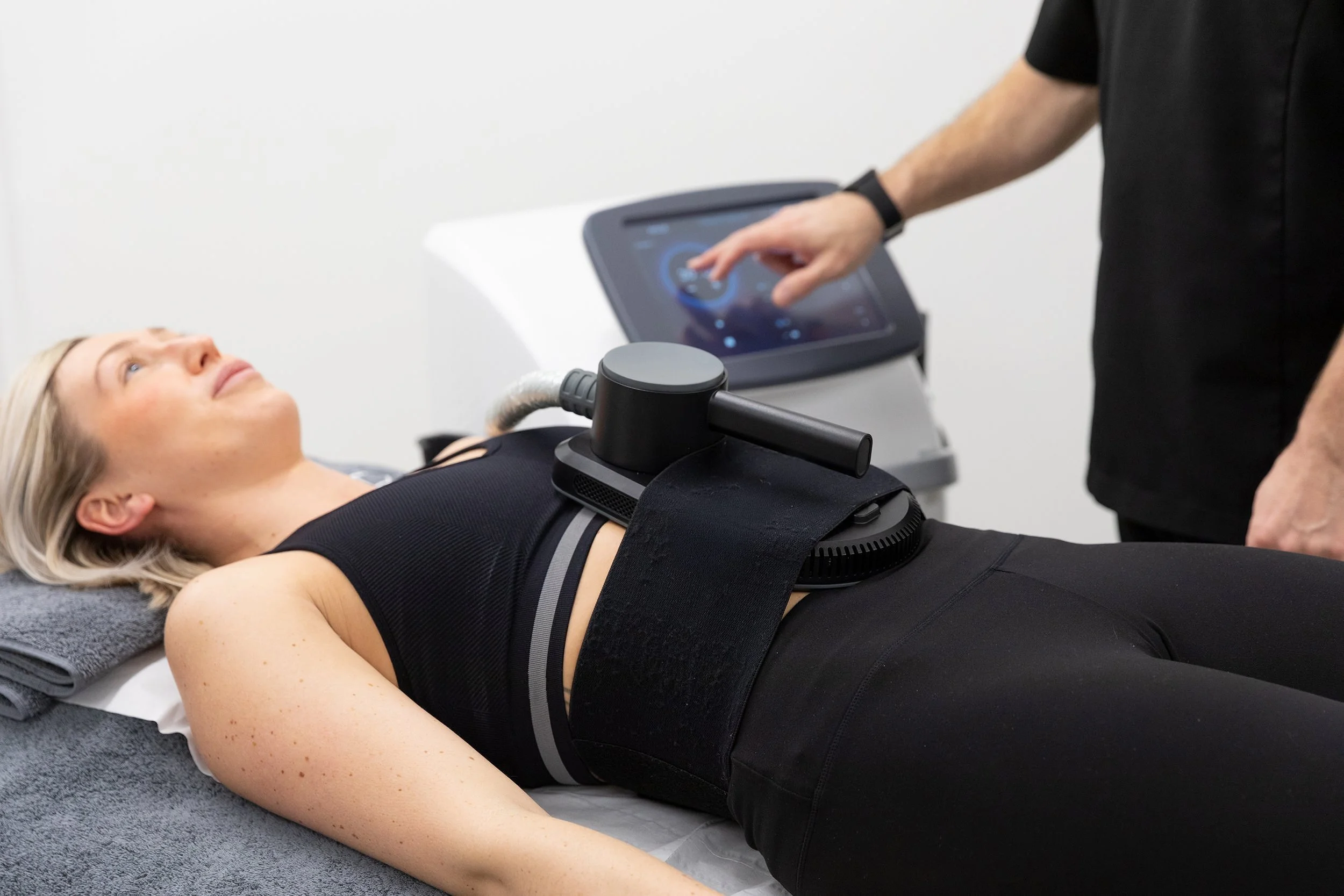 An electromagnetic muscle stimulation treatment that contracts and strengthens muscles, simulating 20,000 sit-ups or squats in one session.